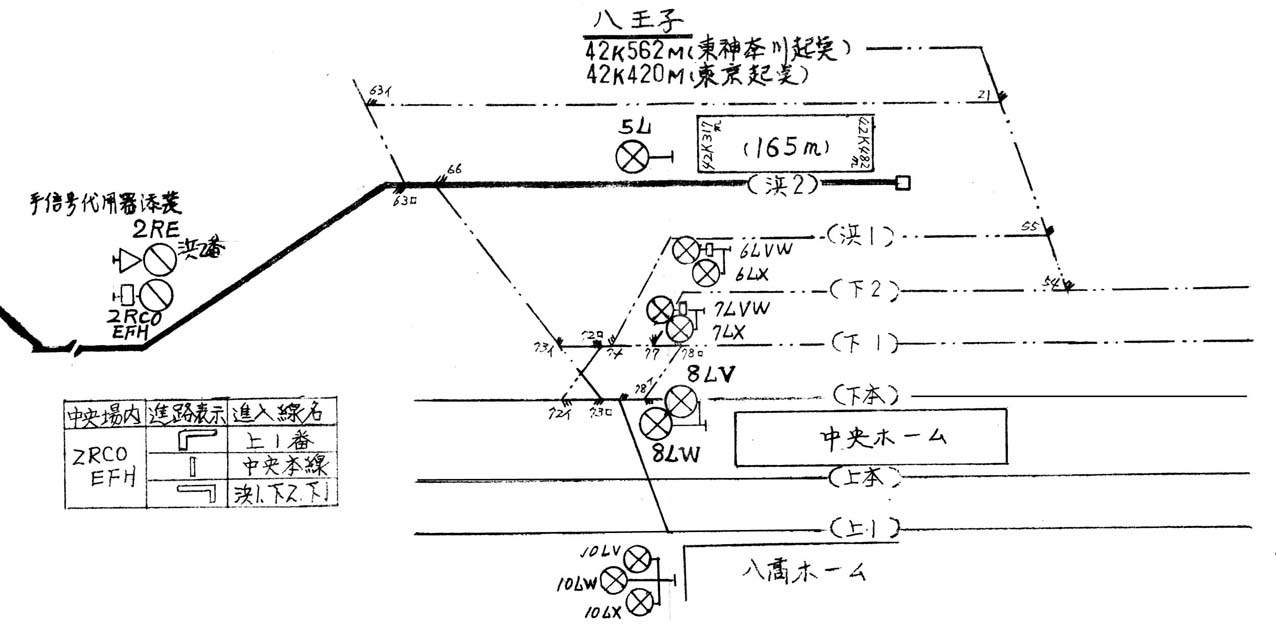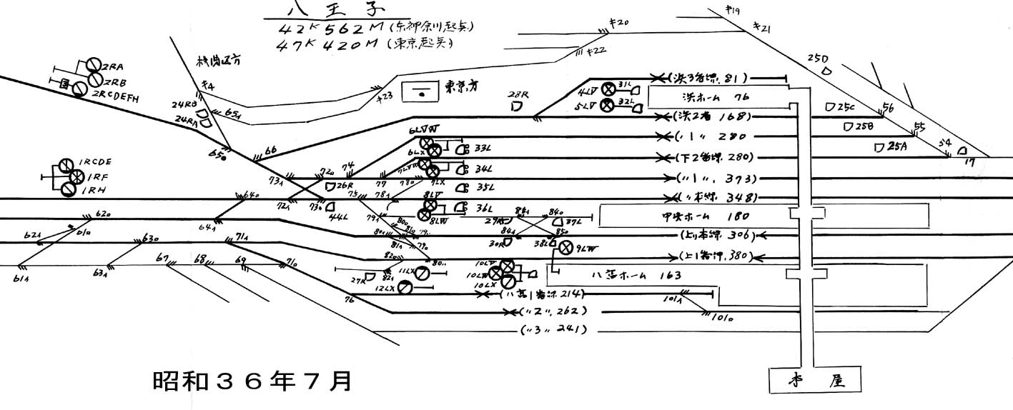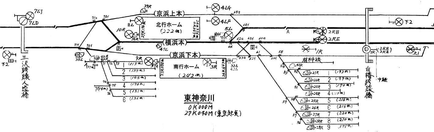 下記の図はこの頃の配線図ですが、横浜線ホーム長は4両分(76m)しかなく連絡階段も1つしかなく