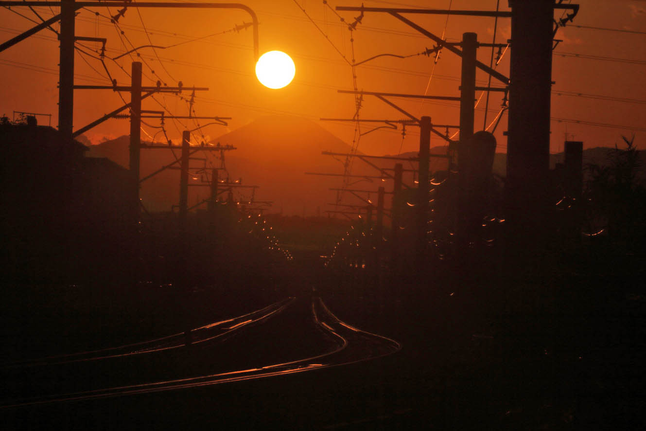 今年の春は横浜線の線路は富士山頂-太陽に向かって一直線になった。 |