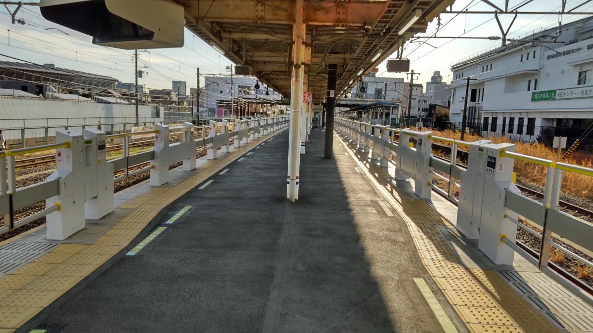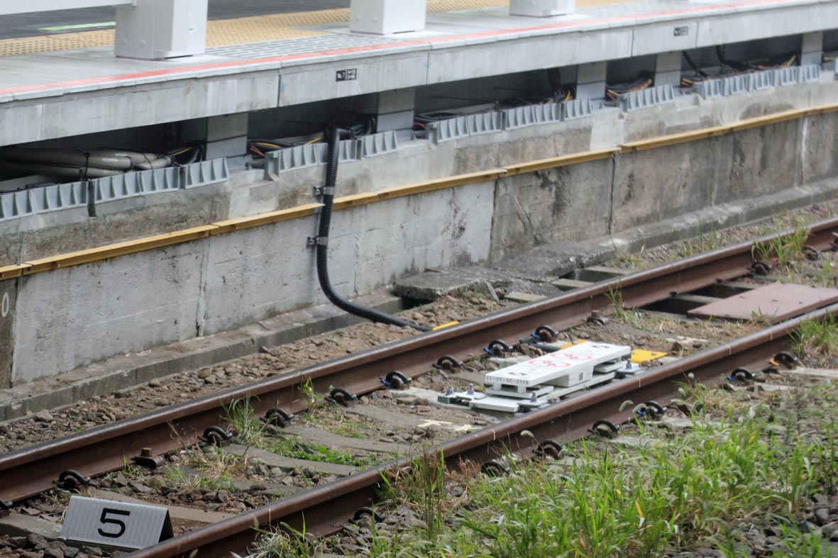 | ホームドア稼働後 ホームドア地上子と5両の停止位置目標(東神奈川側) |